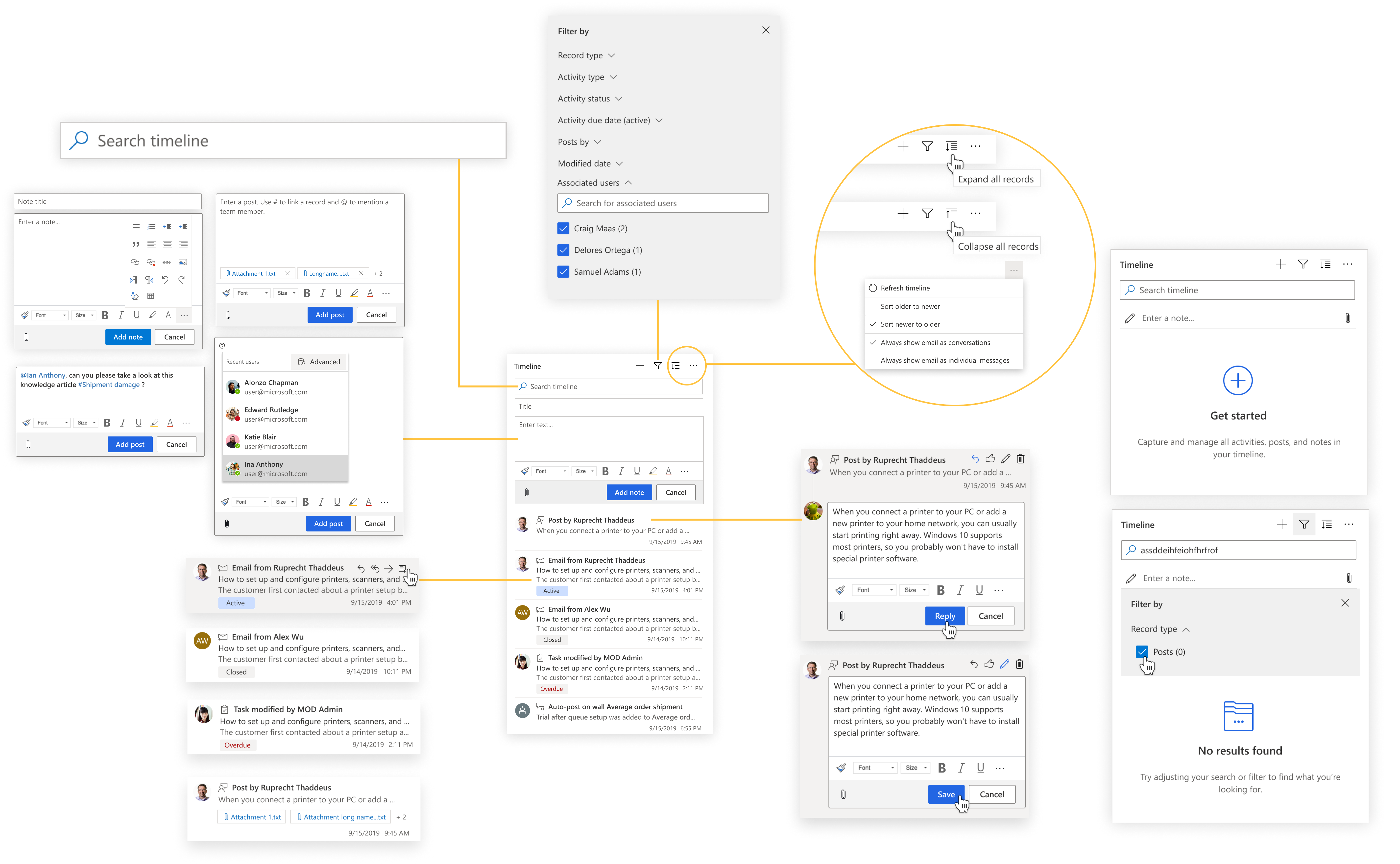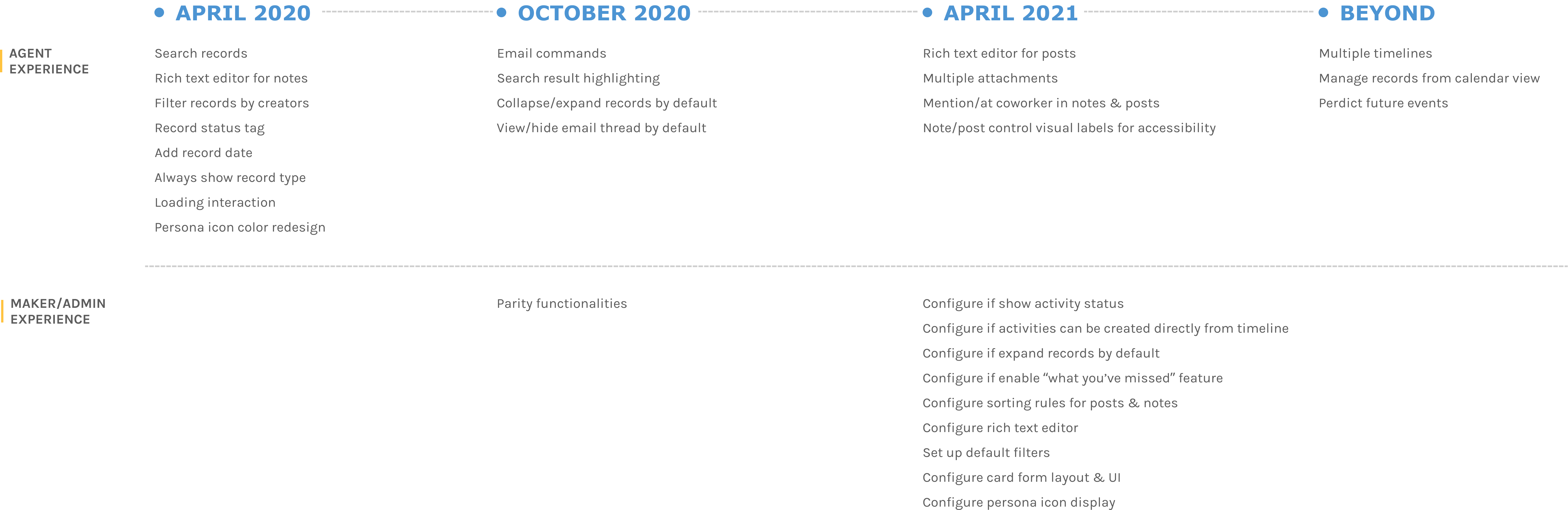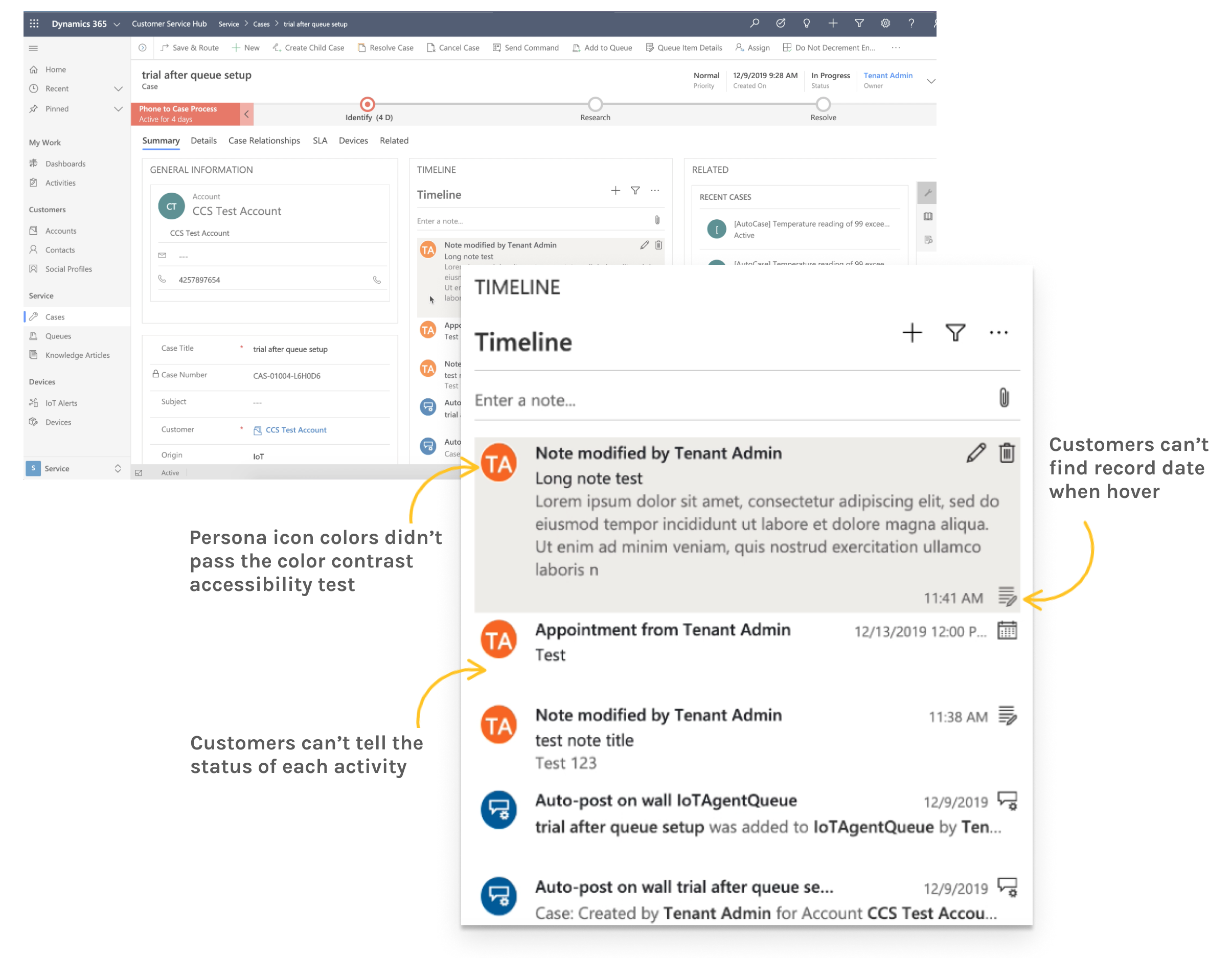 Joining as the first US-based designer, I owned one of the most important features across the Dynamics 365 platform - timeline. Besides Customer Service app, Sales and Marketing apps also use timeline to track customers interactions, major events, to-do items, etc. When I first worked on timeline back in October 2019, the control was problematic, with usability issues and outdated interface.